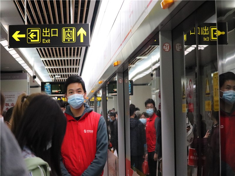 您好,进站请戴好口罩,出示行程码、健康码,出行多加注意安全。一个个身着红马甲的志愿者穿梭在地铁一号线三阳广场站,在闸机和屏蔽门前宣传讲解,在自动售票机前引导购票,在站台上维持秩序,在地铁出入口帮助老人搬运行李……一抹抹红色的身影如同初升的朝阳,以饱满的热情和十足的干劲迎接美丽的春天,成为一道亮丽的风景线。