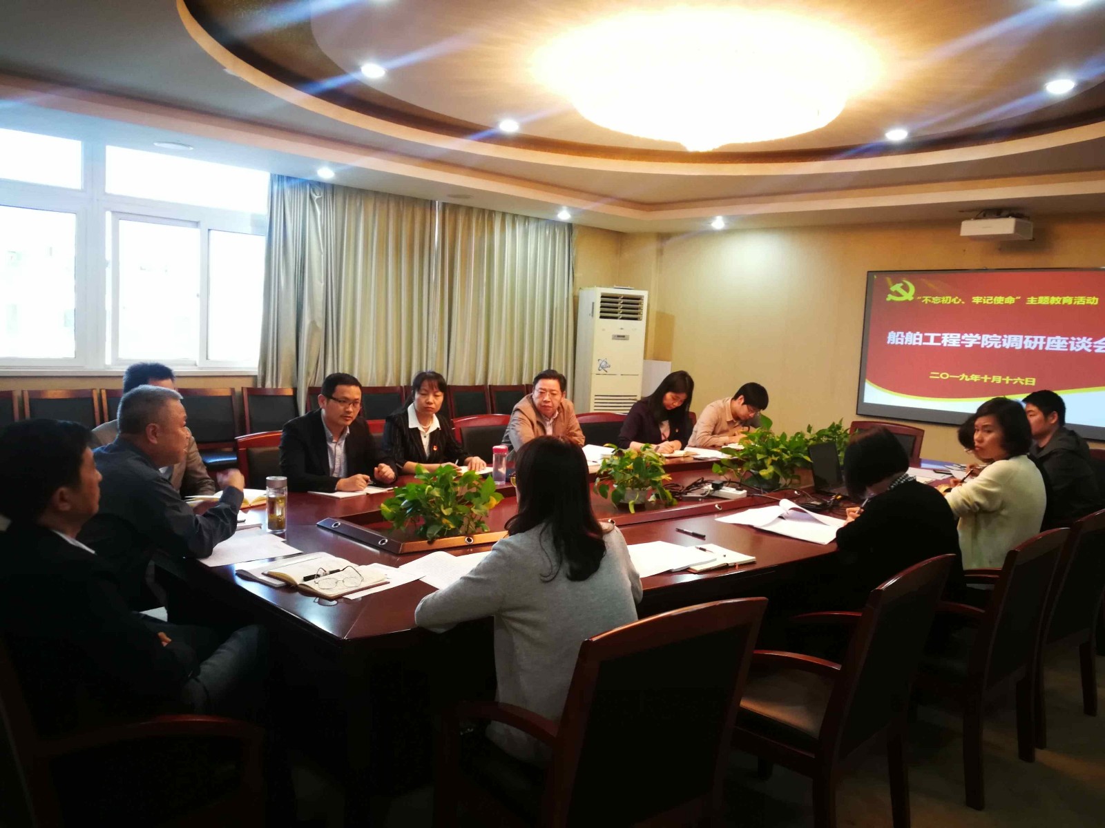 2019年10月16日下午,校党委书记李虎赴船舶工程学院开展“不忘初心、牢记使命”主题教育调研,教务处副处长冯美仙、组织人事处副处长邵敏珠陪同参加,船舶学院书记吴志亚、副院长刘方、综合办主任陈妍、党总支委员、党支部书记、教研室主任、辅导员和教学秘书等相关人员参加了座谈。
