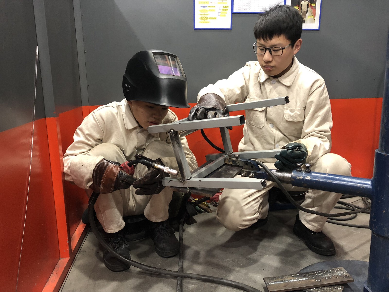 “雷锋是时代的楷模,雷锋精神是永恒的”,171121班贾建男、沈星宇等同学利用自己的专业特长践行雷锋精神,他们将破损的板凳在焊接操作岗位中进行焊补,破损的板凳在电弧光的闪烁下焊接组装完成。因铁板凳的方管较薄,在修理的过程中还遇到了薄板焊接难题,大家积极探讨,请教班主任老师,通过反复尝试后攻克了难题,同学们在做好事的同时又学到了新的技能。