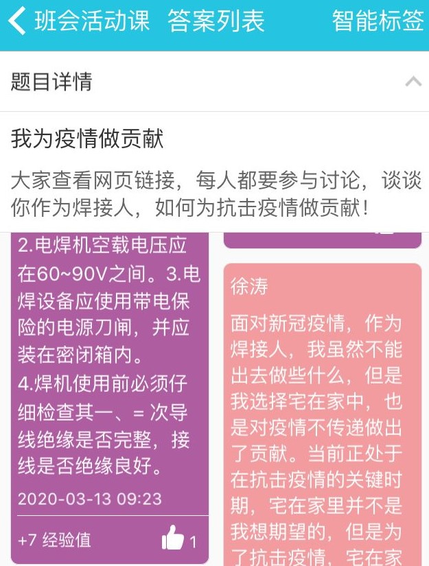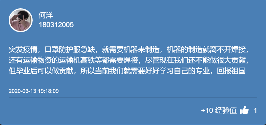 312日,在班主任滕老师主持下,181121班全体同学利用云班课平台召开“我为疫情做贡献”网络主题班会。滕老师通过提前发布焊接工程师者在建设火神山医院的网络报道和相关照片,让同学们展开讨论,作为焊接专业学生,我们如何为抗击疫情做贡献。