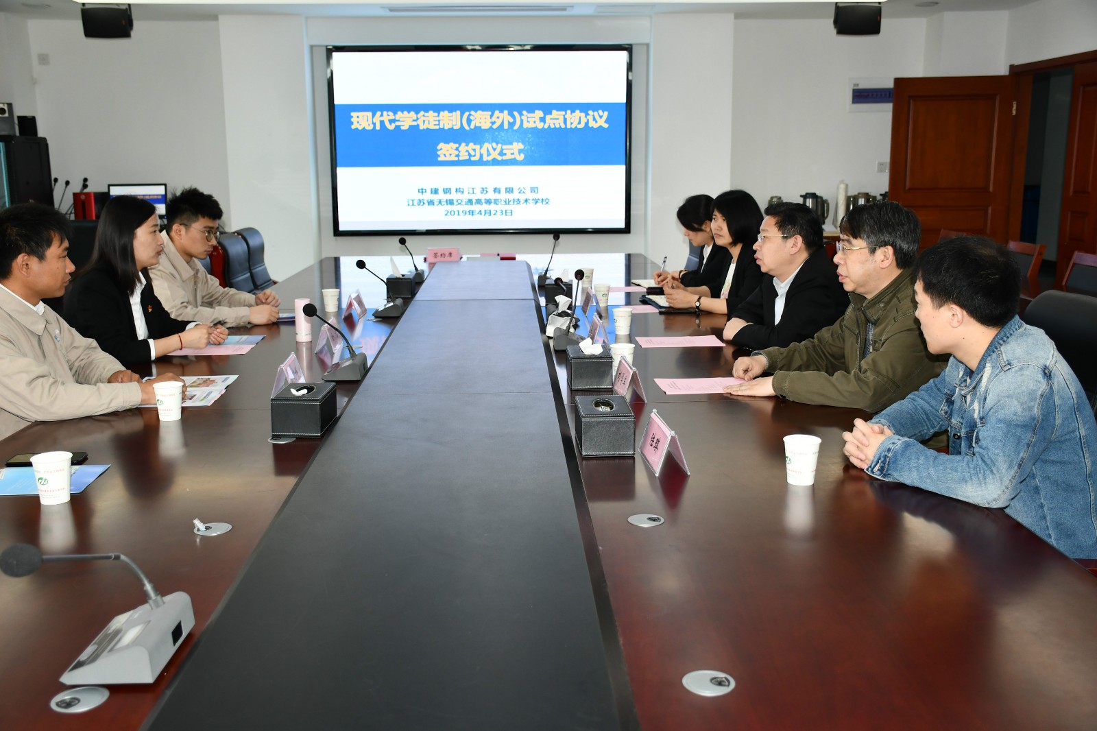 2019年4月23日上午,中建钢构江苏有限公司、乐动平台签订了现代学徒制(海外)试点协议。乐动平台党委书记李虎、学校招生就业处副处长刘学军、船舶工程学院党总支书记兼副院长吴志亚、船舶工程学院副院长刘方;中建钢构江苏有限公司党总支副书记金蕾,焊接中心主任邱明辉,焊培中心实验员缪晓泉等出席了签约仪式。