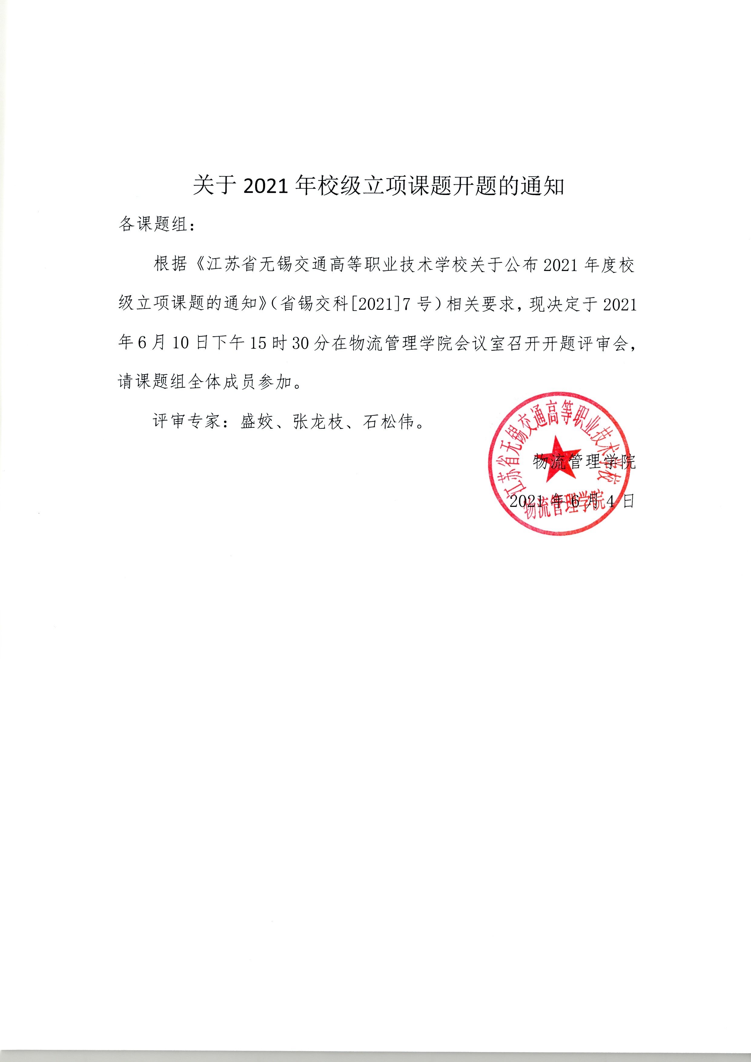 根据《乐动平台关于公布2021年度校级立项课题的通知》(省锡交科[2021]7号)相关要求,现决定于2021年6月10日下午15时30分在物流管理学院会议室召开开题评审会,请课题组全体成员参加。