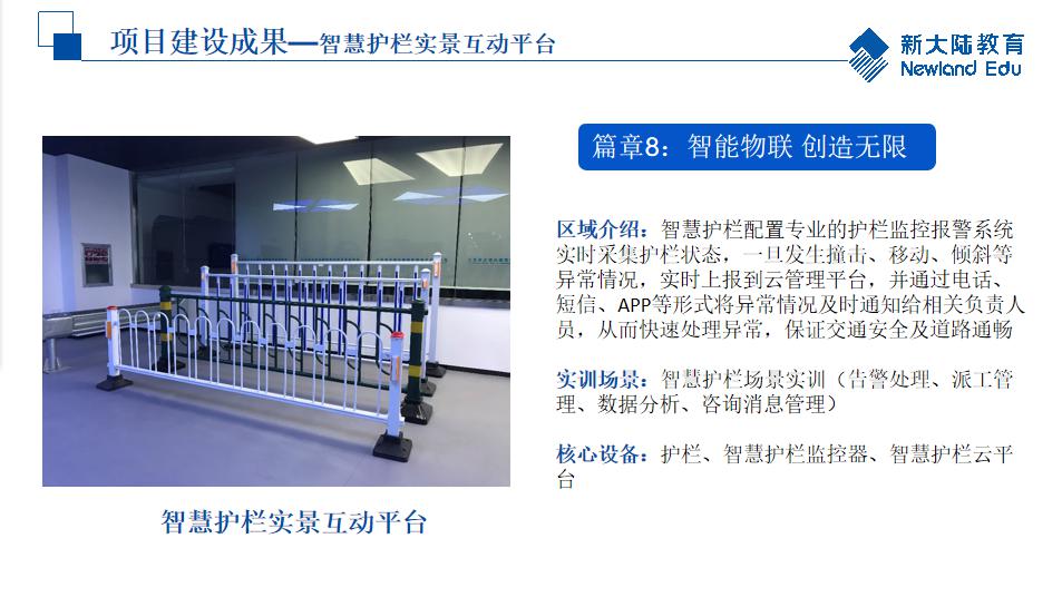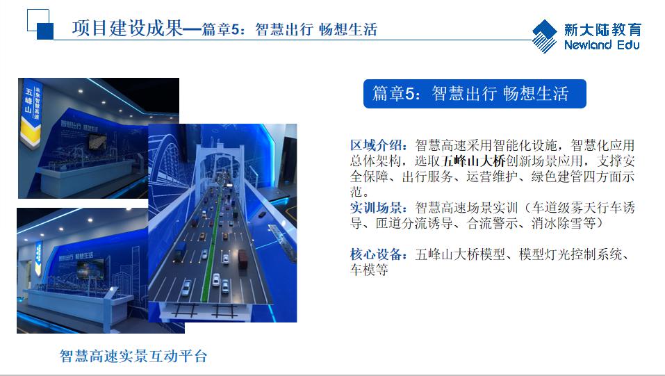 实训基地严格按照建设方案组织建设,精心施工,精益求精,追求卓越,已建成物联网关键技术实训室、智慧物流实训室、物联网综合应用实训室、智能交通实训室以及交通物联网技术综合展厅。综合展厅主要由开启智慧之路(综合可视化平台)、智融科技全数前行(智慧物流)、智控互联跨界融合(识别系统、智慧出行畅想生活(五峰山智慧大桥)、智能物联 创造无限(智慧路口)、智融智联智控慧行(智能快递)、智慧城市(交通大沙盘)、智慧护栏、智慧灯杆、文化长廊等部分组成,实训基地整体氛围极具现代科技感。